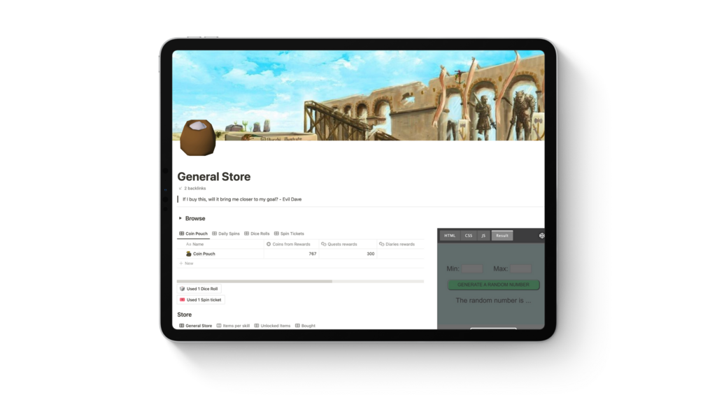 - General Store - Keep a log of your wish list in the general store, rewarding yourself only when you have enough coins in your pouch. Earn those coins by completing quests and diaries!