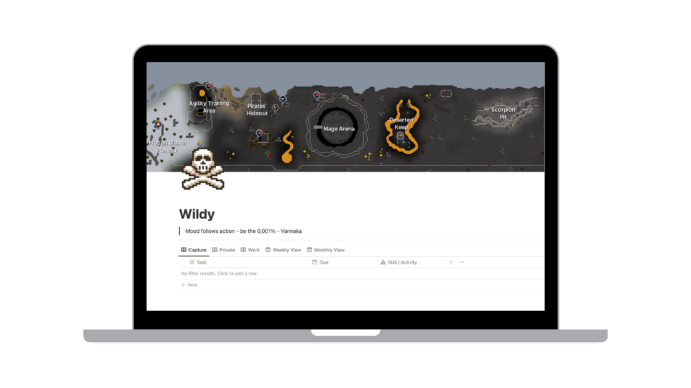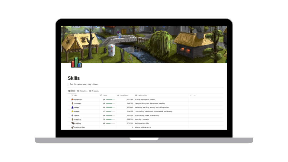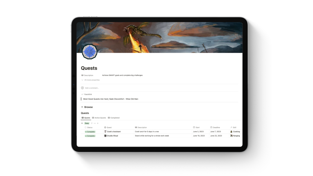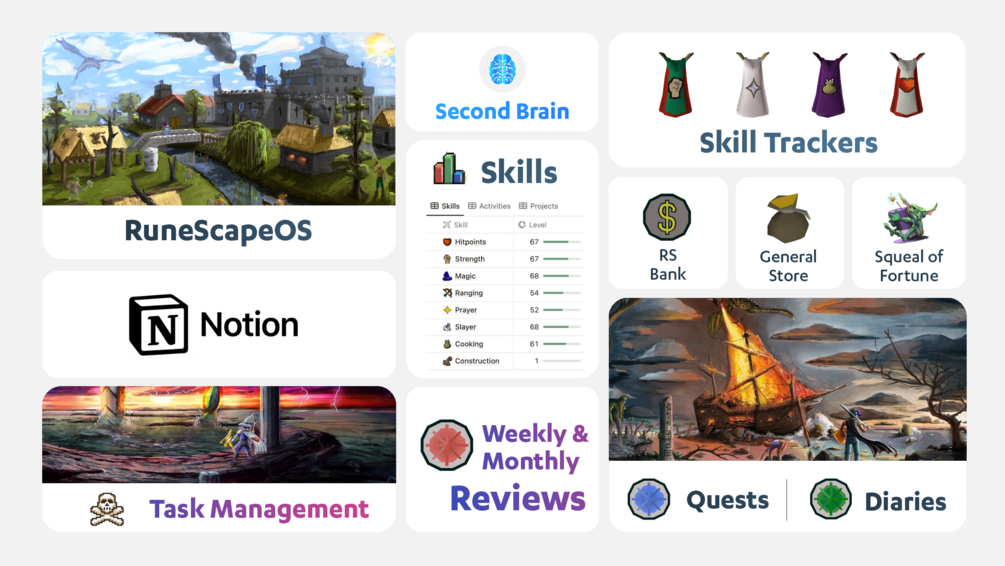 Make your real life an epic adventure with this fully automated Runescape Notion template.